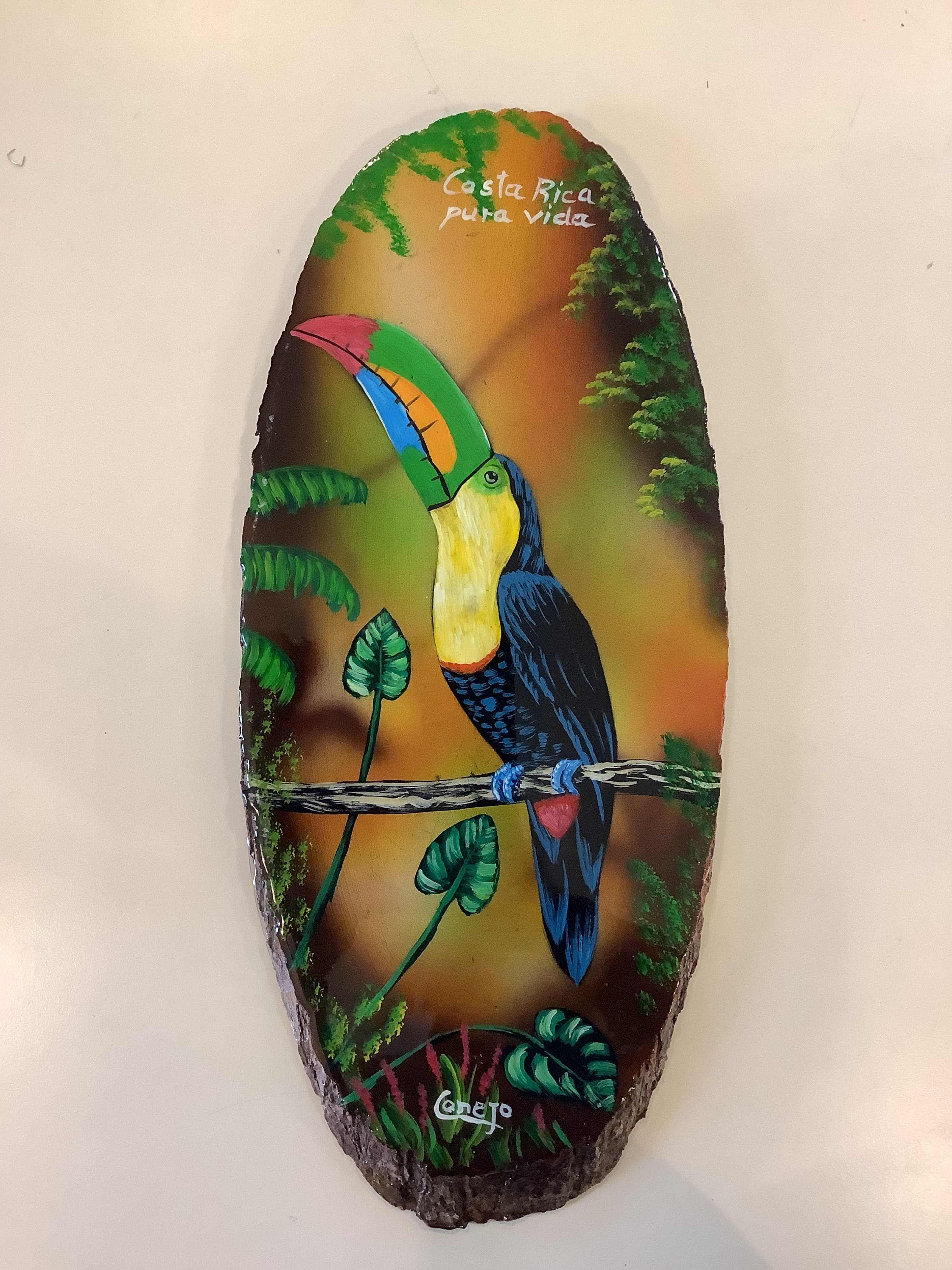 Voici deux images : une photo du groupe de Costariciens devant l'entrée du collège et une image du Toucan sur bois offert par les costariciens.